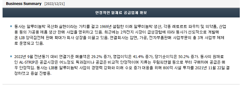 Business summary를 확인 했을 때 알루미늄박, 레토르트 파우치, 2차 전지 LIB양극집전체를 판매한다고 합니다.