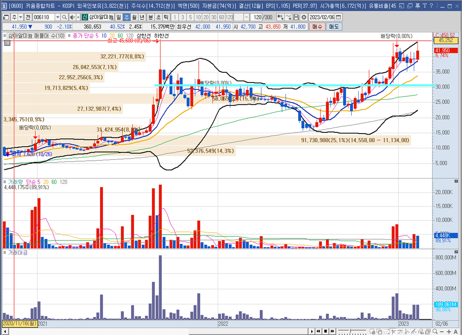 삼아알미늄이라는 종목의 주봉차트입니다. 기나긴 횡보를 지나 전고점을 1회터치 한 뒤 다시 바닥을 다지며 숨고르기하면서 고점을 돌파하고 상승하고있는데요!