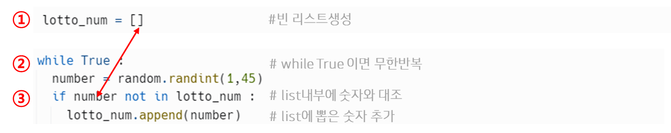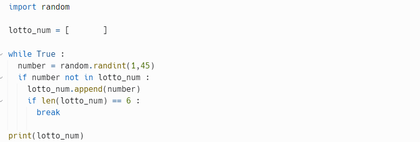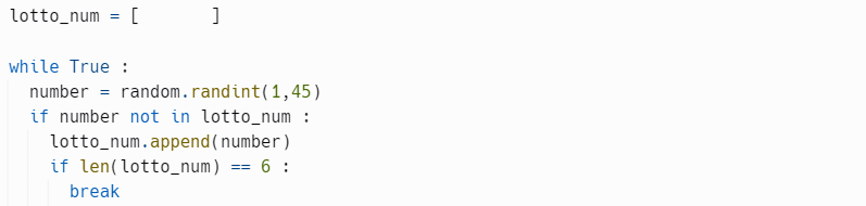 lotto_num이라는 리스트에 원소의 개수가 6이면( == ) while 루프를 break 하라는 식을 아래에 추가로 작성 해봤습니다.