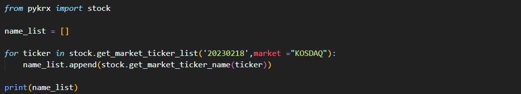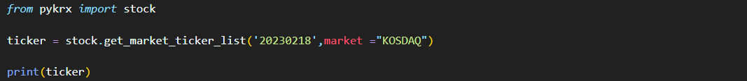 예시로 2023년 2월 18일에 코스닥 시장에 상장되어 있는 주식들의 ticker를 확인해 보도록 해요.