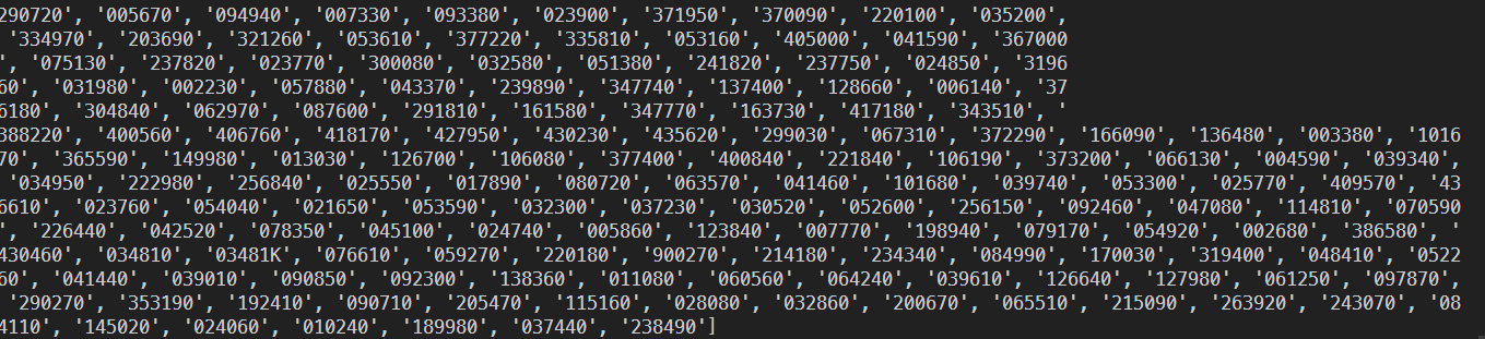 코드를 실행하면 다음과 같이 리스트 형태로 2023년 2월 18일 코스닥 시장에 상장되어있는 종목들의 ticker 가 전부 출력되는 것을 확인 하실 수 있습니다. 1623개의 종목이 상장되어 있네요 😮