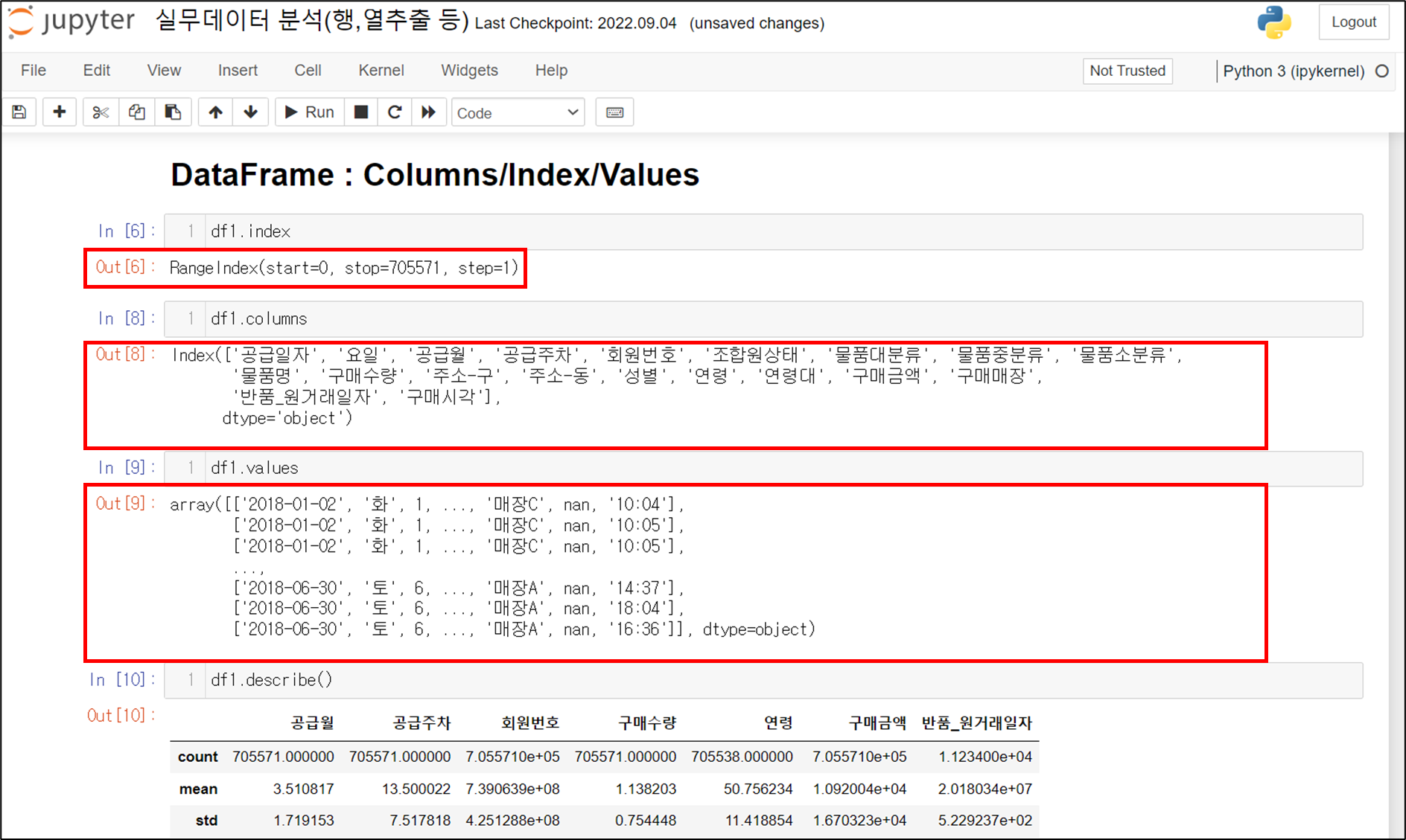 JupterNotebook은 다음과 같이 데이터의 특성을 바로 확인 할 수 있고 Out 창에 결과 값의 이력까지 보이기 때문에 데이터 분석 시 아주 용이하겠죠!