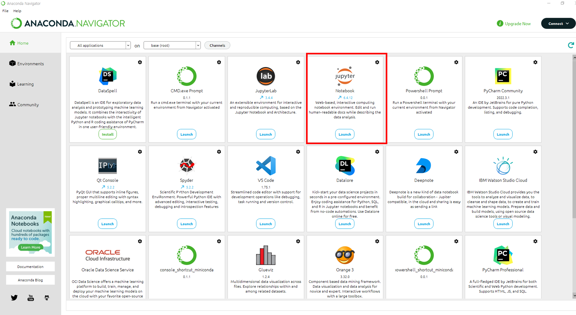 아나콘다 내부에 여러가지 Application 중에서 우리는 JupyterNotebook이라는 것을 이용할 예정입니다.
