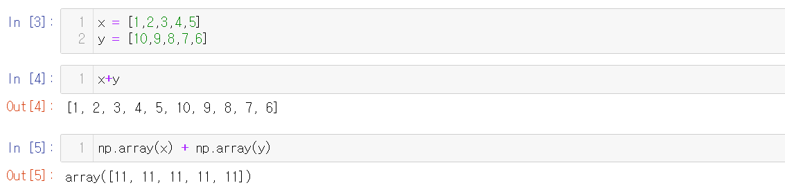 그냥 x +y 를 출력하면 list 끼리 합쳐지는 것을 볼 수 있으나, array의 경우는 각각 1대 1로 매칭해서 실제로 연산을 하는 것을 볼 수있습니다.