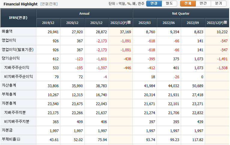 2022년 9월 141억의 영업이익으로 흑자 전환하였으나 위에서 언급한바와 같이 2022년 4분기 추정치는 다시 적자전환 할 것으로 보이네요😪