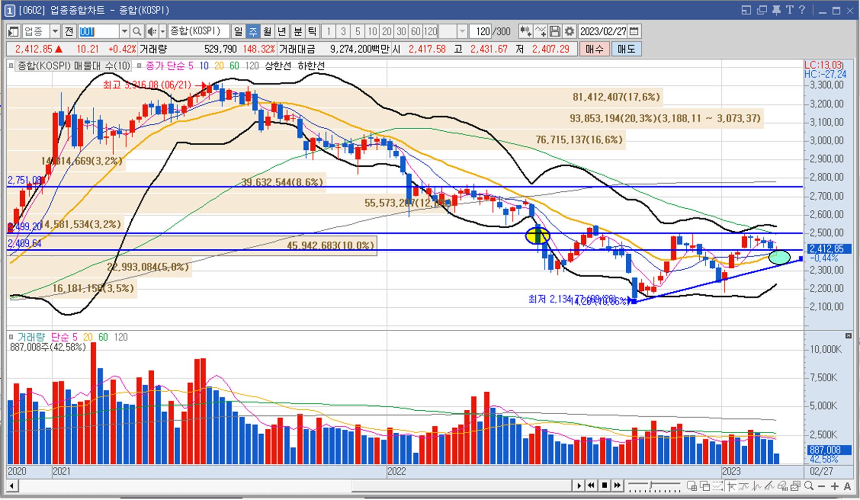 2400선을 다시 회복은 하였으나, 추세선상으로는 하락의 여지는 남아있으니 주의해야겠습니다.