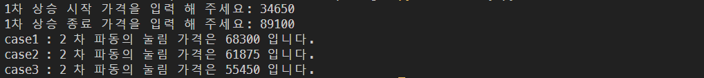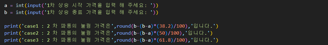 이 수식과 함께 이전에 공부한 input 함수를 이용해서 1차 파동 시작가격(a), 1차 파동 종료 가격(b)를 입력해서 코드를 작성해 보았습니다😊