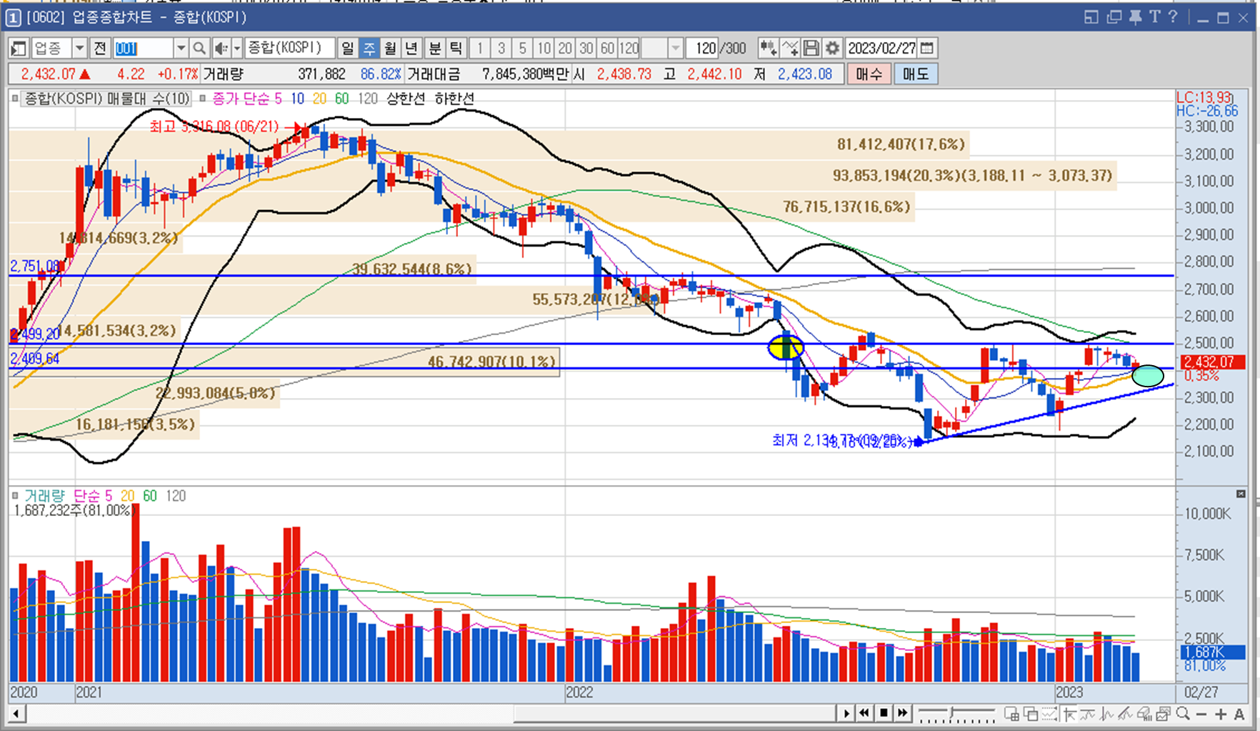 KOSPI 종합지수의 주봉 차트입니다. 다행히 금요일 종가 기준(주봉 종가)으로 지지선인 2410선을 회복하는 모습을 보였네요!