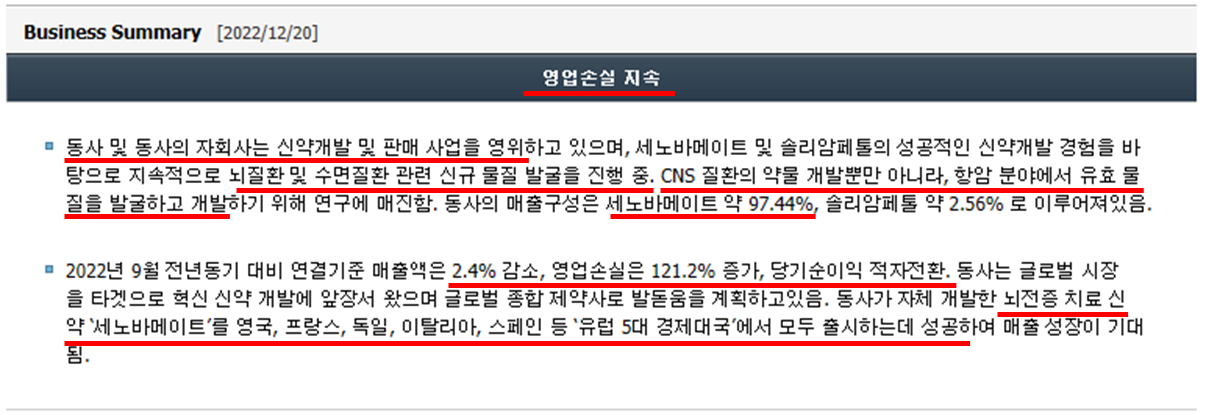 분명 Business Summary 란 에서는 "세노바메이트"가 유럽 출시를 했다고 했는데 해당 내용은 없고 "DMB-3115"라는 관절염, 궤양성 대장암 등 염증성 치료제인 "스텔라라"의 바이오 시밀러 제품이 임상 3상 동등성 입증했다는 내용만 가득 하네요.