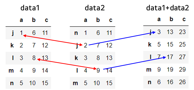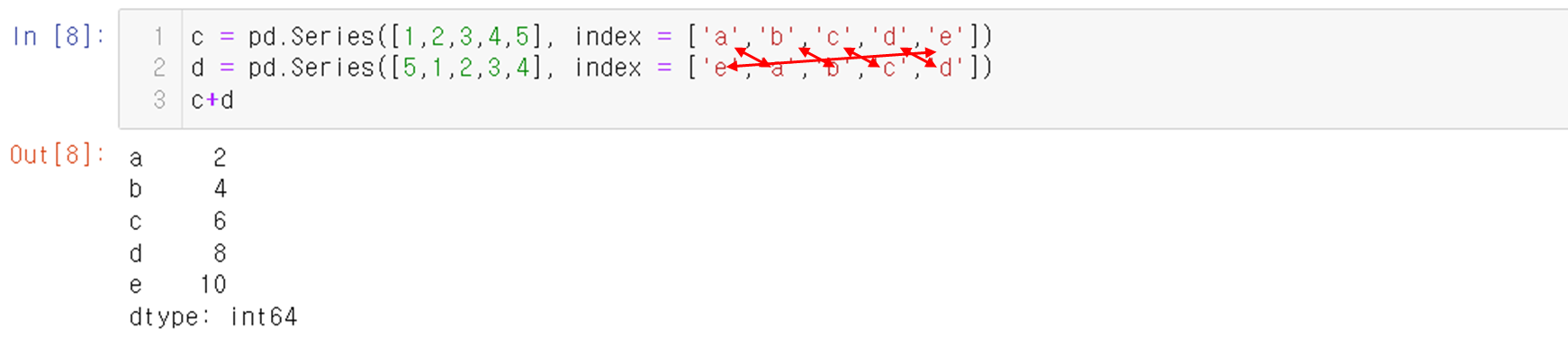 c,d라는 변수에 동일한 index를 부여하고 덧셈을 실행했을 때 같은 index 끼리 맞춰서 덧셈하는 것도 가능합니다!