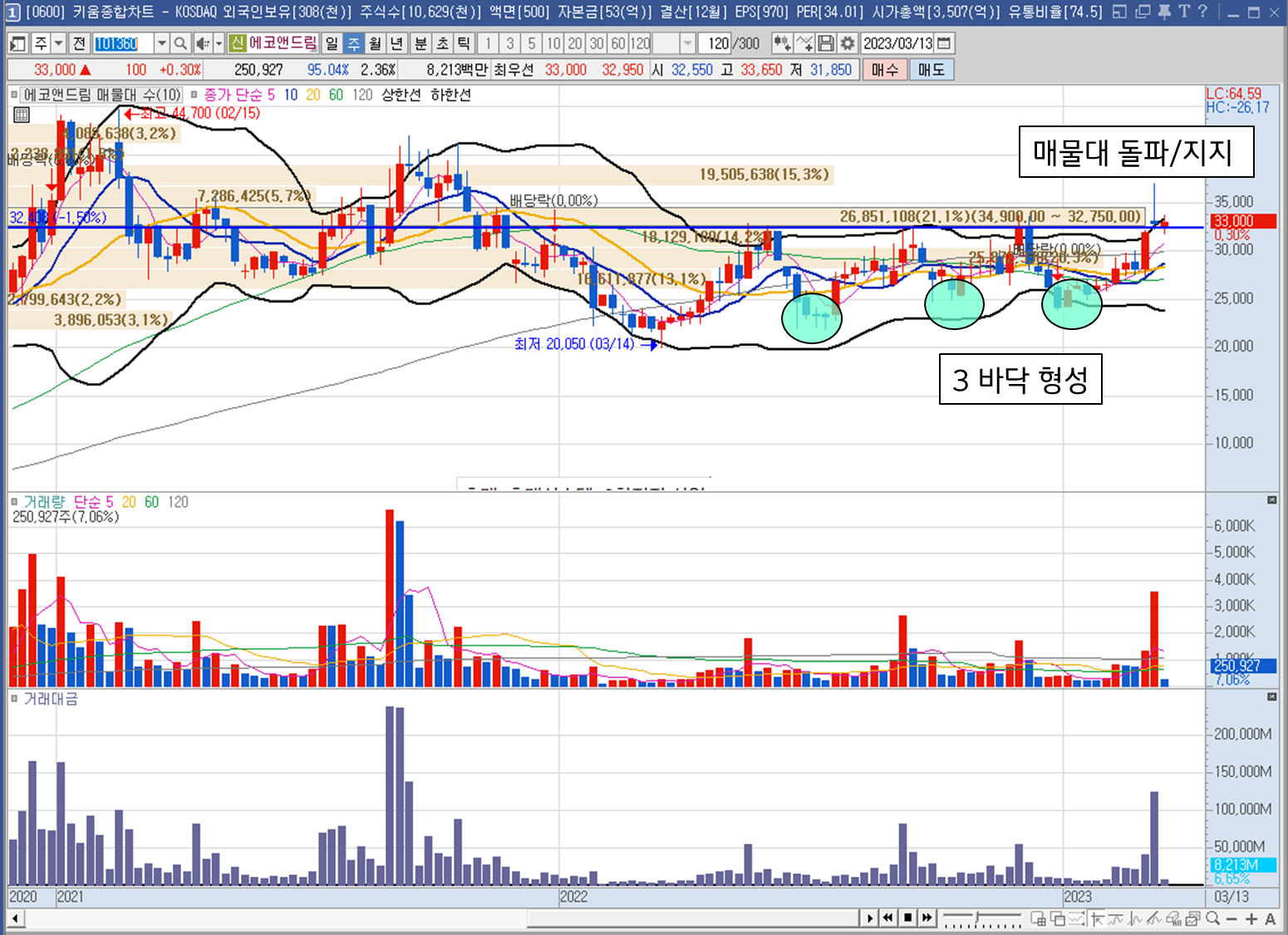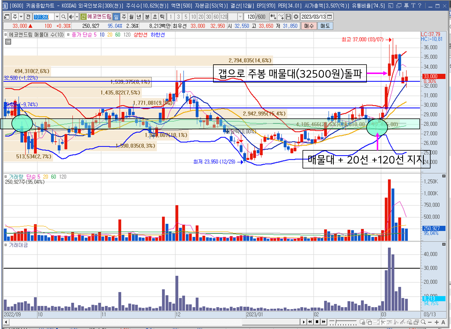 에코앤드림의 주봉차트입니다 장기간 32500원 부근 매물대에 막혀 실망 매물이 출회한 이후에 3바닥을 형성하여 진짜 바닥을 확인하고 (여러번 바닥 확인은 위험 신호 일 수도 있으니 떨어지는 봉에서 매수 하는것이 아닌 바닥을 찍고 바로 올라오는 상승 봉을 확인해야 합니다!) 특정 호재로 매물대 돌파, 돌파한 매물대 부근을 지지하는 모습을 보입니다.