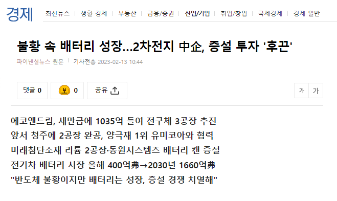 전구체 공장 증설 투자로 인한 이익 축소, 부채 증가는 호재로 다가 올 수 있으므로 관련 뉴스를 서칭해봐야겠습니다.