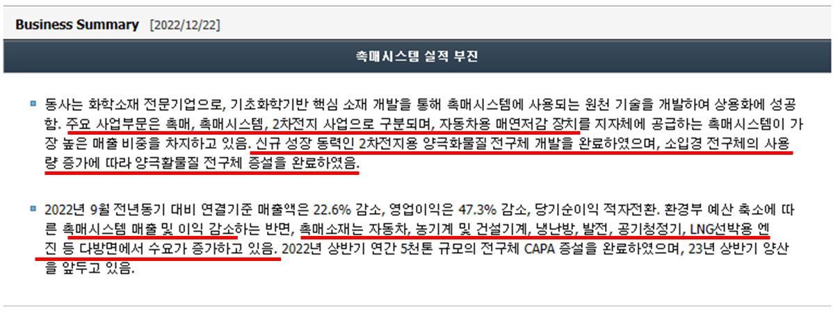에코앤드림이라고해서 직관적으로 봤을 때 이름이 너무 포괄적이라 감이 안왔는데 촉매, 촉매시스템, 2차전지 총 3가지의 사업을 하고있네요. 이엔드디라는 더 어려운 이름에서 조금 쉽게 회사명을 변경했네요(?)