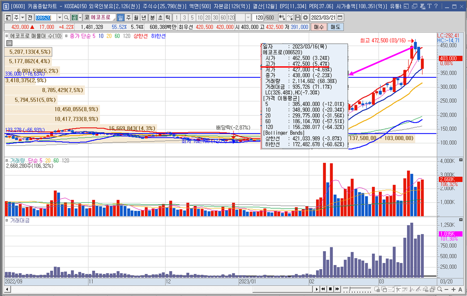 주봉상 가격대를 확인해보면 직전 음봉의 고점인 336000원 부근의 지지정도가 확인이 되네요 역사상 신고점이기 때문에 주봉상은 크게 특이사항이 없네요😶
