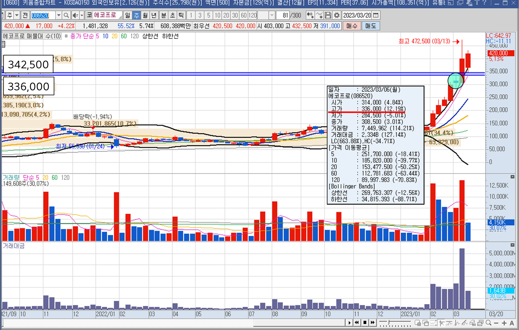에코프로의 일봉 차트를 확인해보면 2023년3월20일 저가 기준 342,500원(-13.02%)까지 급락한이후 종가로 양봉까지 끌어올리는 기이한 현상이 있었는데요 이 때 어느시점에 올랐는지 주봉,일봉,분봉단위로 잘게 쪼개서 확인해보도록 해요!