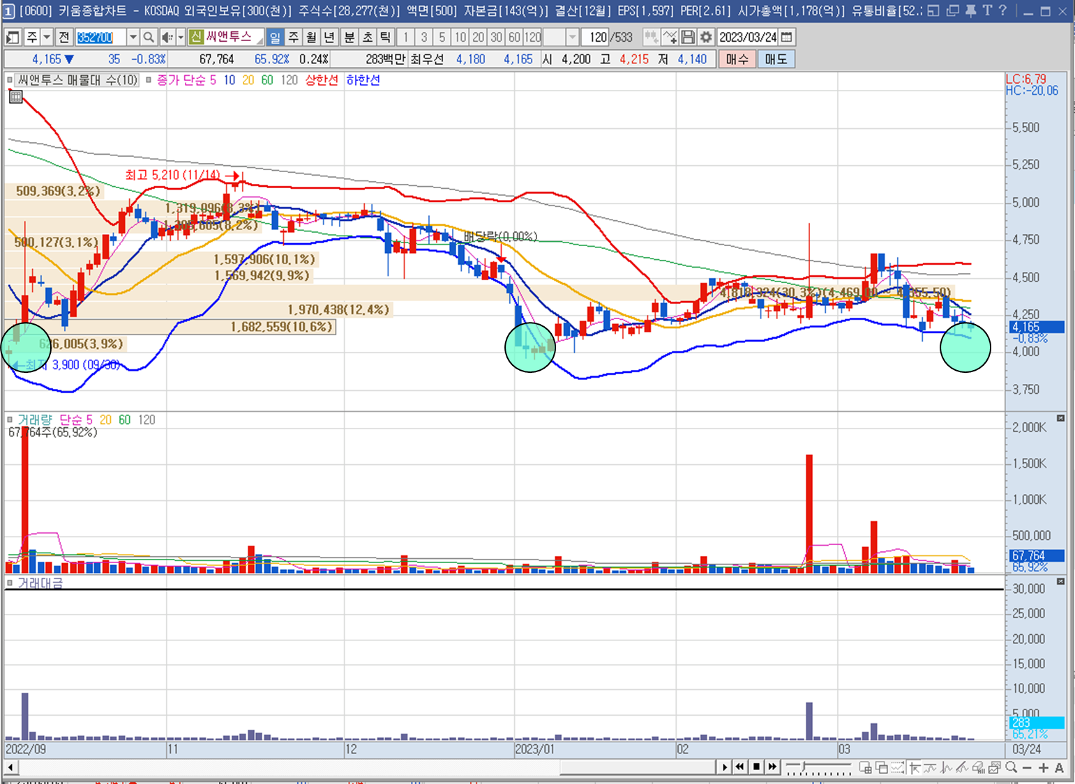 최근 6개월가량 큰 거래 대금이 터진 날도 없고 현재 기준에서의 거래대금은 10억미만으로 관심도가 확 떨어져있는 상황이네요 😭