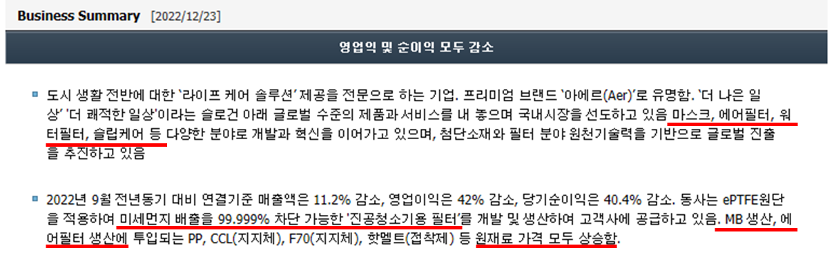 고효율 필터 소재인 MB(Melt Blown)생산, 에어필터 생산에 투입되는 원재료가격이 상승하면서 실적이 부진해지고 있는 상황이네요