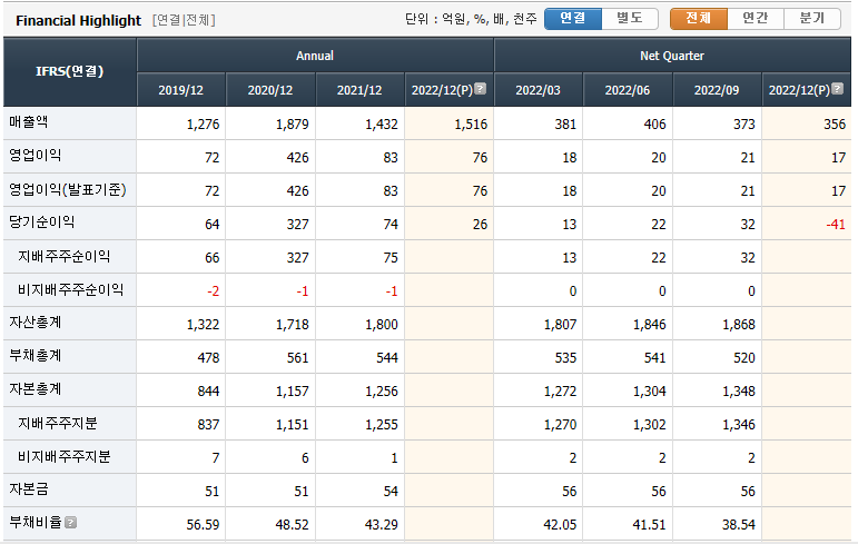 영업이익은 2020년 코로나 19 팬데믹 때 426억의 정점을 찍고 현재는 1/5 수준에도 못미치는 76억에 영업이익을 보여주네요 코로나로 반짝한 기업인 듯합니다. 그래도 자본금은 충분히 쌓아두고 부채비율도 적정 수준을 유지하고 있어 클린룸 관련 경험을 바탕으로 사업진출을 꽤하면 성장 가능성이 충분히 있을 듯합니다.