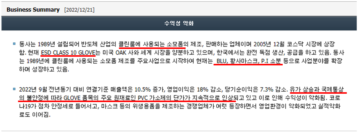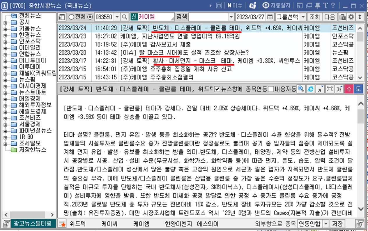 최근 용인에 반도체 클러스터를 형성한다는 이슈로 클린룸 테마주로 부각 되고 있다는 뉴스, 엔데믹으로 탈 마스크 시대라는 뉴스 , 황사/미세먼지 마스크 테마주로 엮여있는 이슈등 여러가지 호재악재가 있는것으로 보이네요!