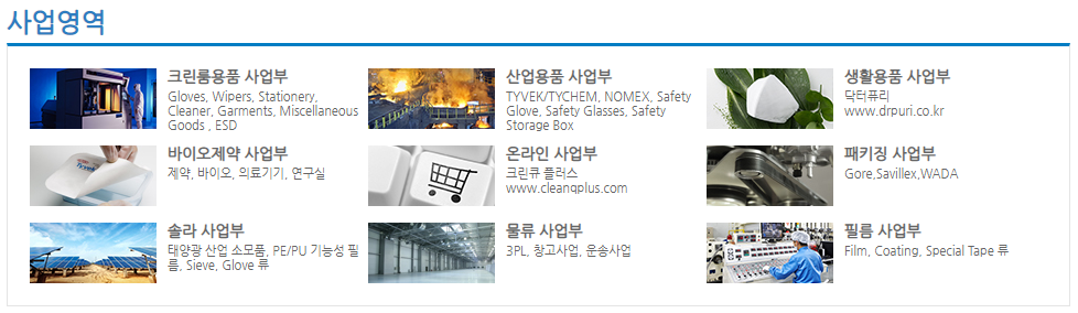 공식 홈페이지 확인 결과 클린용품, 바이오, 필름, 패키징 등 이물에 치명적 일 수 있는 사업군들에 집중적으로 영역을 확장 하고 있는듯 합니다.