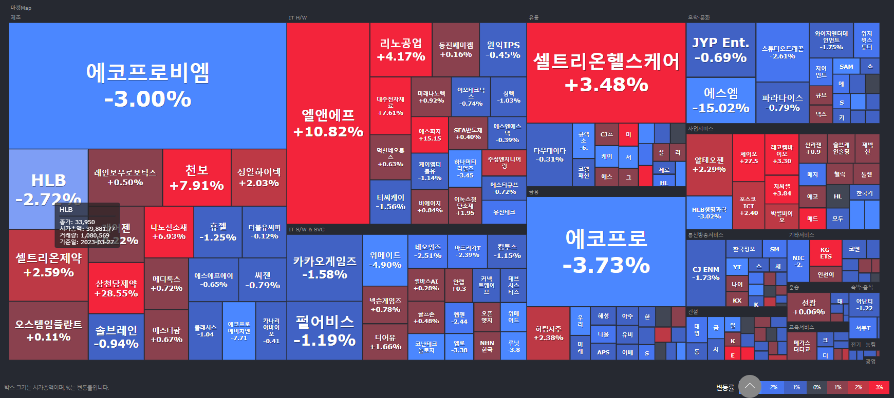 한경마켓맵입니다 2차 전지 관련 대장주 에코프로, 에코프로 비엠등 일부 종목이 하락하고 제약 바이오 주가 슬슬 부각 되면서 상승 하고 있는것으로 보입니다. 흐름이 슬슬 바뀔 것으로 보이니 제약 바이오 관련주들을 매집해 볼 생각입니다.