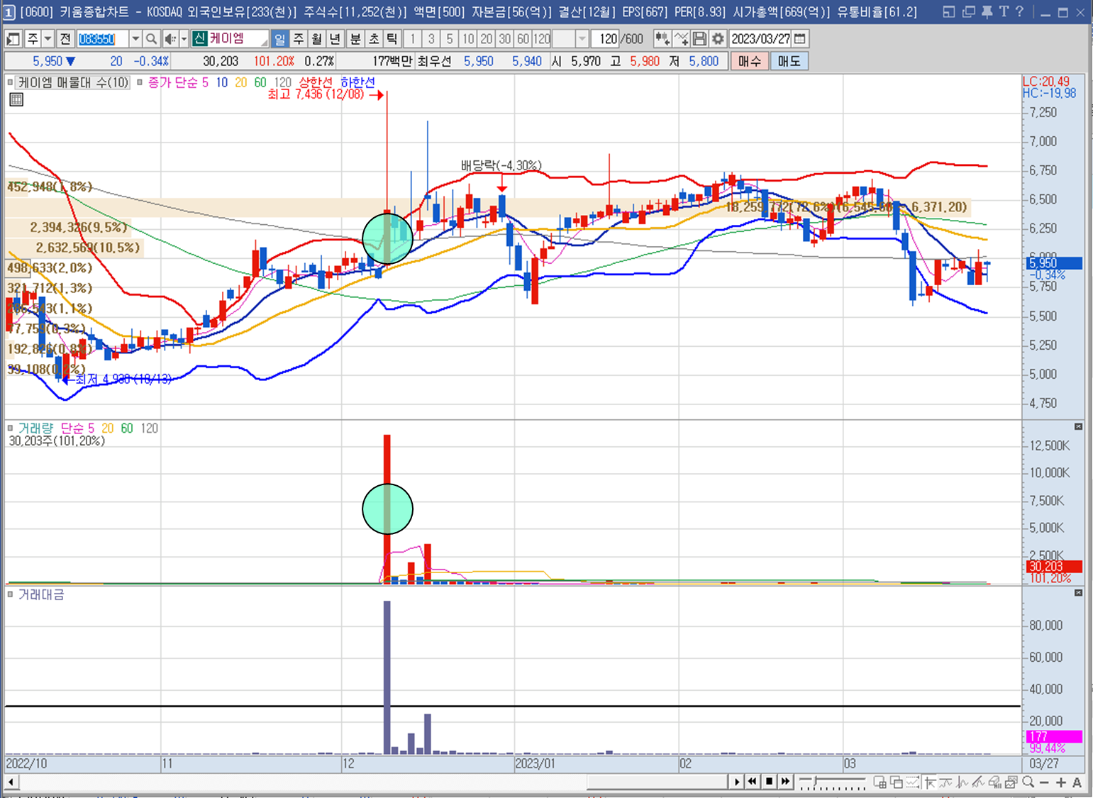 거래량이 터진시점인 22년 12월 8일 부근에도 특별한 이슈가 없고, 기술적 반등으로 120선 돌파지점에서 거래량이 쏠려 반짝 대규모 거래량이 실린 것으로 보입니다. 시가총액이 낮은 종목들은 정말 이슈 없이 급등락을 반복 할 수 있다는 것을 보여주는 사례네요🤨