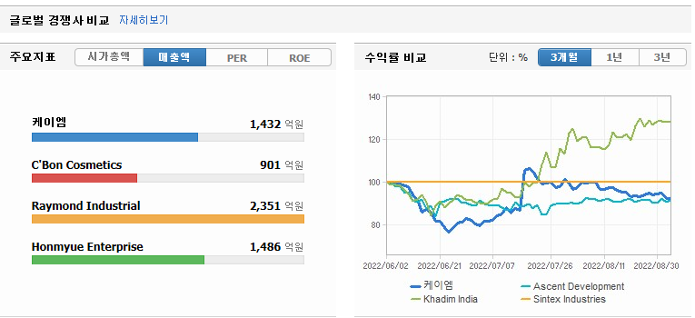 케이엠의 시가총액은 703억으로 정말 가격이 낮은 축에 속하네요 이러한 종목은 변동성이 심하니 꼭 시가총액을 체크하셔야합니다. 글로벌 경쟁사 비교 지표를 확인해봤는데, 전혀 상관 없는 화장품 기업, 지게차 등 건설기계 기업 들이랑 비교하니 다음번 분석에서는 해당 항목 제외 후에 다른 항목을 추가하여 분석 진행해 봐야 할 것 같습니다.😪