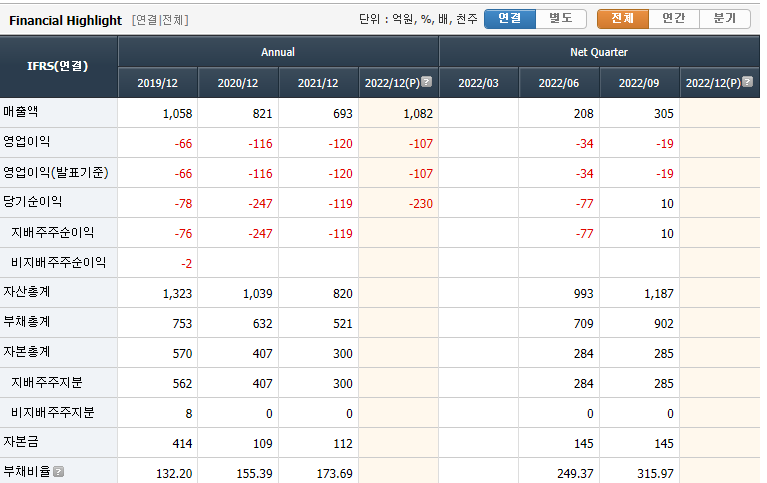 실제 보유하고 있는 자본이 이제는 300억 수준 밖에 안남았는데 당기순이익은 -230억 수준이고 고금리시대에 부채비율이 매우 높아 자본잠식이 일어나고 있습니다. 이러한 자본잠식되고있는 기업은 상장폐지가 될 수 있으니 주의하도록 해요!