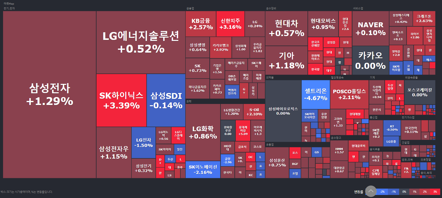 오늘은 반도체주 삼성전자, 하이닉스가 고르게 상승했고 석유 화학주인 LG화학, 롯대케미칼 은행주, 자동차주 모두 전반적으로 고르게 상승하면서 1%대의 상승으로 마감했습니다.