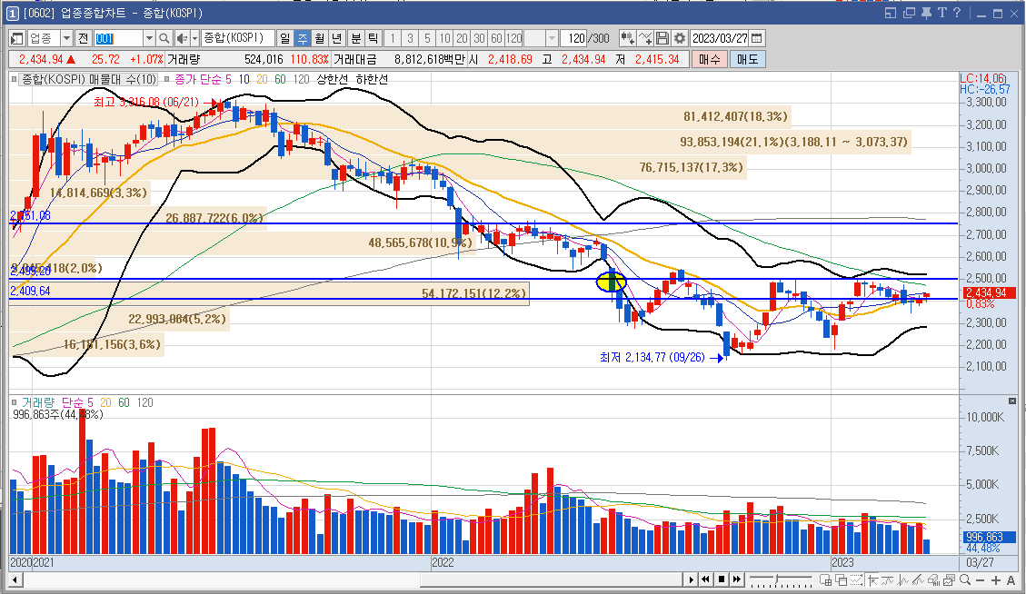 코스피의 업종 종합 차트입니다. 2400~2500선에서 맞고 빠지고 맞고 빠지고를 반복하고 있는와중에 저점을 높이면서 수렴하고 있으니 기술적 분석으로는 좋은 위치에 있는 상태네요! 주 마감까지 확인 해보도록합시다.😉