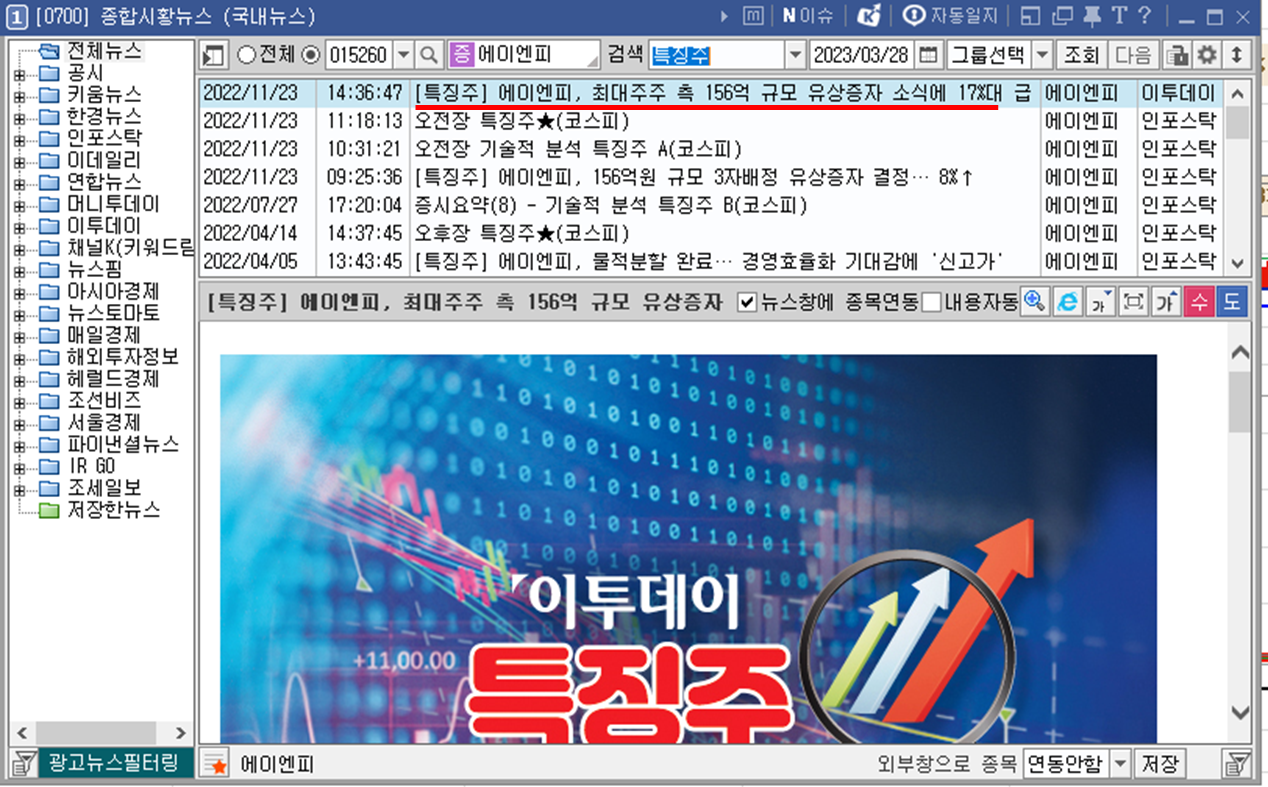 종합시황뉴스를 확인해보면 일봉 차트 앞부분에서 급등한 부분은 유상 증자 소식으로 급등 했다는 소식이 있네요. 대부분의 유상 증자라는 소식은 주식에서 악재로 작용하지만 이러한 자본 잠식이 진행되고 있는 기업에서는 자금 조달이 시급하기 때문에 유상증자 소식은 호재로 작용 할 수 있습니다.