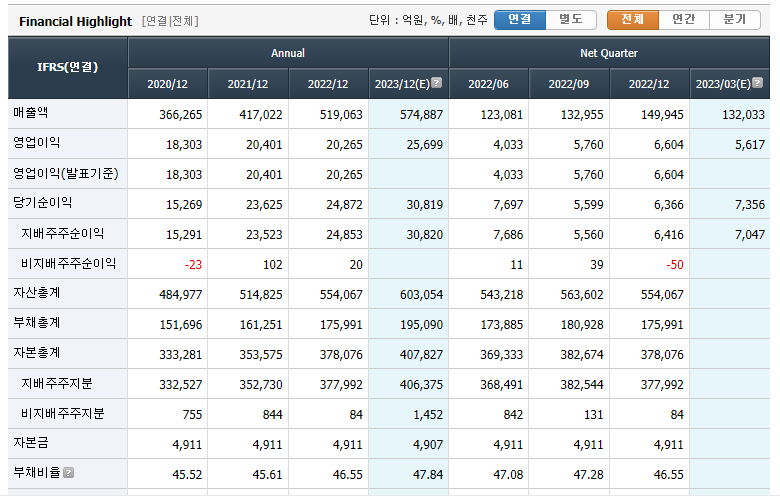 영업이익은 2020년 이후로 지속 성장하고 있고 2023년 추정치 전망도 긍정적으로 예상하고 있습니다. 자본도 시가 총액 대비 2배 정도의 자본을 가지고 있고 부채도 적정 비율 (100% 아하) 로 유지하고 있는 등 안정적인으로 확인됩니다.