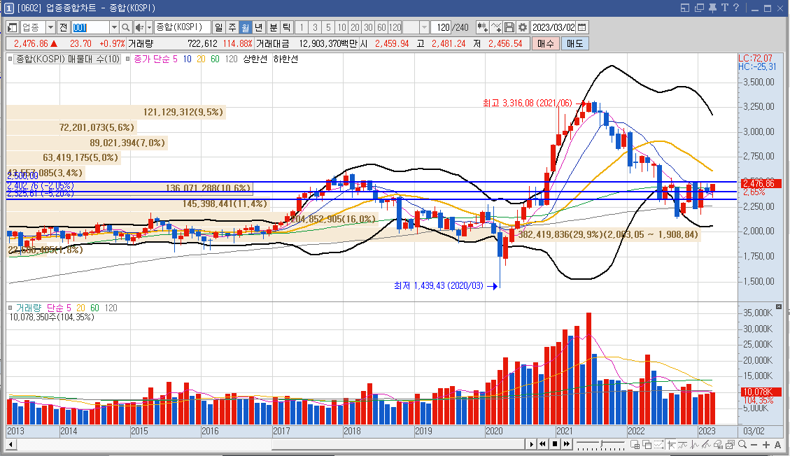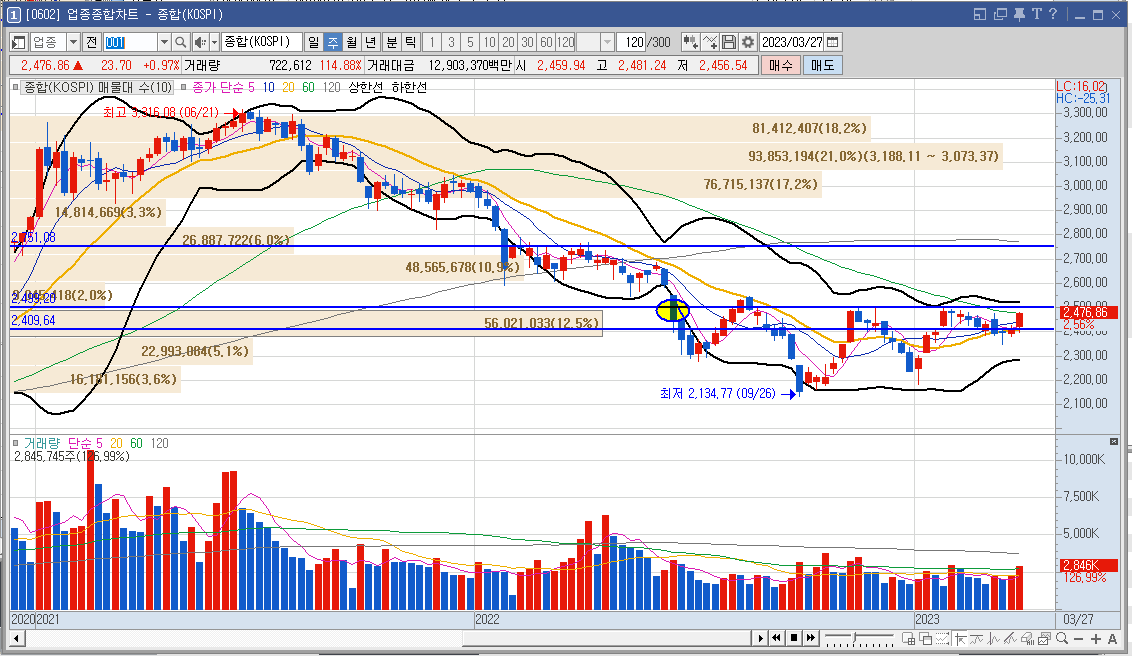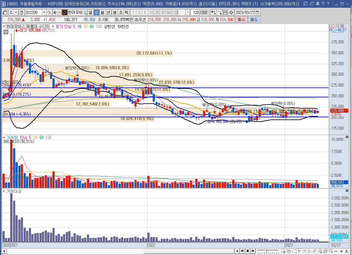 현대모비스의 일봉 차트 입니다. 사실 이렇게 시가총액이 큰 종목에 대해서는 항상 수급이 어느정도 일정하게 유지가 되기 때문에 기술적 분석을 하기에는 매우 어렵습니다. 단순히 매물이 어디에 형성되어있고 어디에서 지지하는지 정도만 확인 가능합니다.