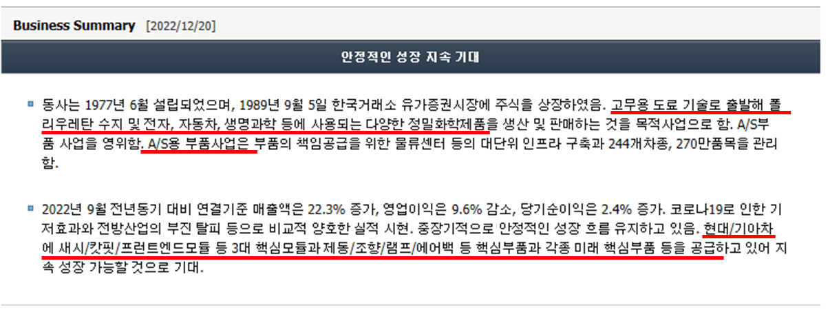 2022년 상반기 세계 주요 자동차 업체 판매량 데이터를 확인해보면 1위 도요타 (513만), 2위 폭스바겐그룹 (400만), 3위 현대차 그룹 (329만) , 4위 르노닛산미쓰비시얼라이언스 (314만), 5위 스텔란티스 그룹 (301만대)로 현대차 그룹은 글로벌 탑 3로 높은 위치에 있네요 ! 아무래도 자회사이다 보니 독점 공급을 할텐데 확장성을 따져보면 다른 완성차 업체에 공급하지 않는 이상 정체 될 수 있는 사업군이네요😥