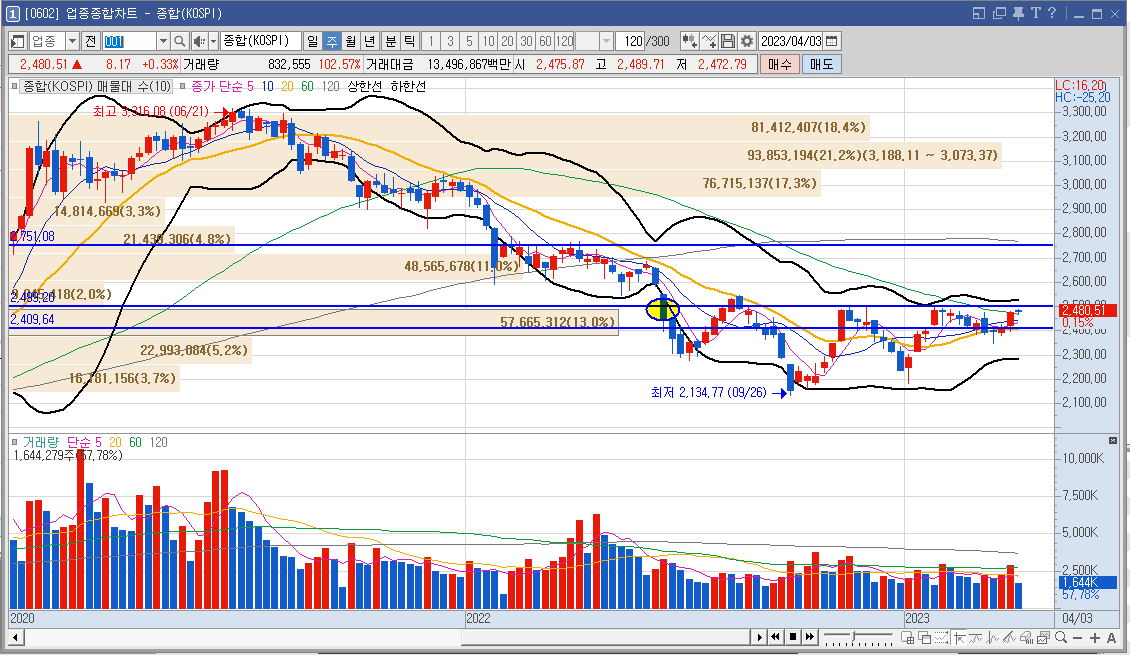 코스피 주봉차트를 확인해보면 저항선인 2500선 근처로 근접했습니다. 시총이 큰 종목의 호재가 들어와야 2500선을 뚫을 수 있겠습니다.