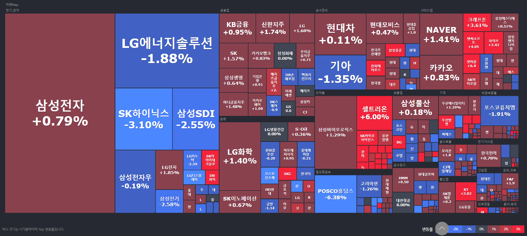 한경에서 제공하는 코스피 일일 마켓맵입니다. 삼성전자가 소폭상승했으나 하이닉스, 2차 전지 관련주인 LG에너지솔루션, 삼성 SDI 가 큰폭으로 하락했네요. 제약 주인 셀트리온, 삼성 바이오로직스가 그나마 상승해서 지수가 강보합권에서 마감한듯 보입니다. 전반적으로 숲을 보면서 하루에 돈이 어디로 집중되는지, 어떤 종목군들이 스멀스멀 올라오는지 확인하는 습관을 항상 갖도록 합시다!