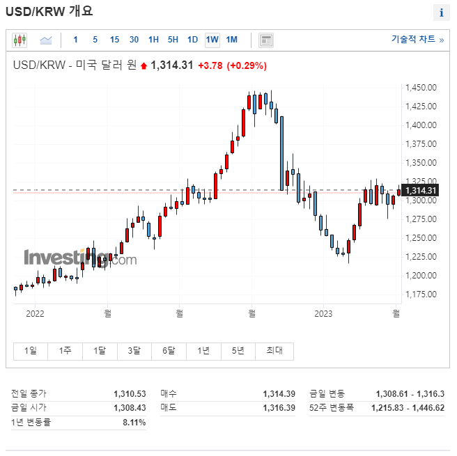 OPEC의 원유 감산 이슈로 떨어지고 있던 석유가격이 갭으로 상승하는 모습을 보여주고 있습니다. 인플레이션 압박속에서 석유가격이 오르게되면 전반적인 물가가 상승하기 때문에 굉장한 악재로 작용 할 수 있습니다. 계속 무언가 안좋은 신호가 나오고 있는듯해 불안하네요🤔 달러 또한 최근 고점 부근으로 상승하고있습니다. 주봉차트상으로는 거진 저항대 부근으로 다가 왔으나 안심하기는 이른 상황입니다.