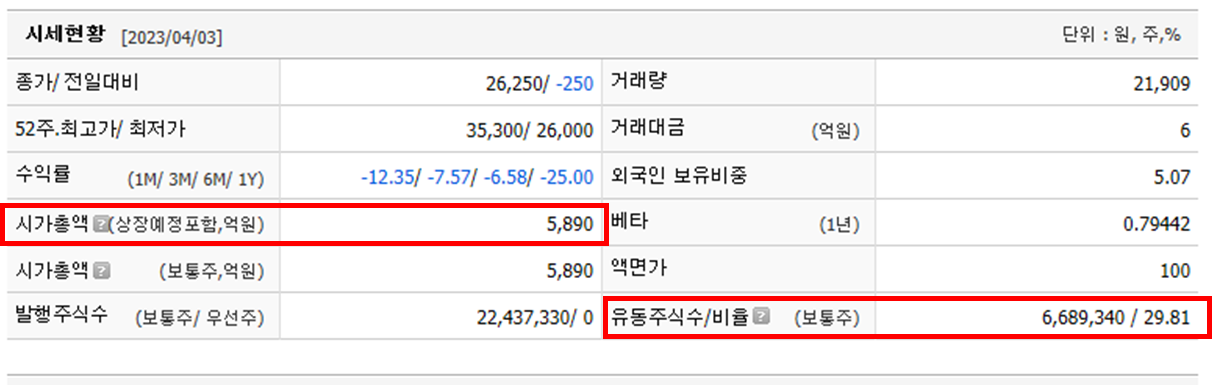 시가총액은 5890억원으로 제가 가장 선호하는 시가 총액을 가지고 있습니다! 2000억≤시가총액≥1조원 해당 시가총액을 선호하는 이유는 어느정도의 안정성도 있으면서 움직임도 확실히 있는 종목이기 때문이에요 ! 유동주식 비율은 30%로 많이 부족한 실정이네요. 유동 주식이 매우 적으면 거래량 없이 크게 상승/하락하는 경우가 있을 수 있고 이는 종합적인 시장 상황과 연결 될 가능성이 높습니다.