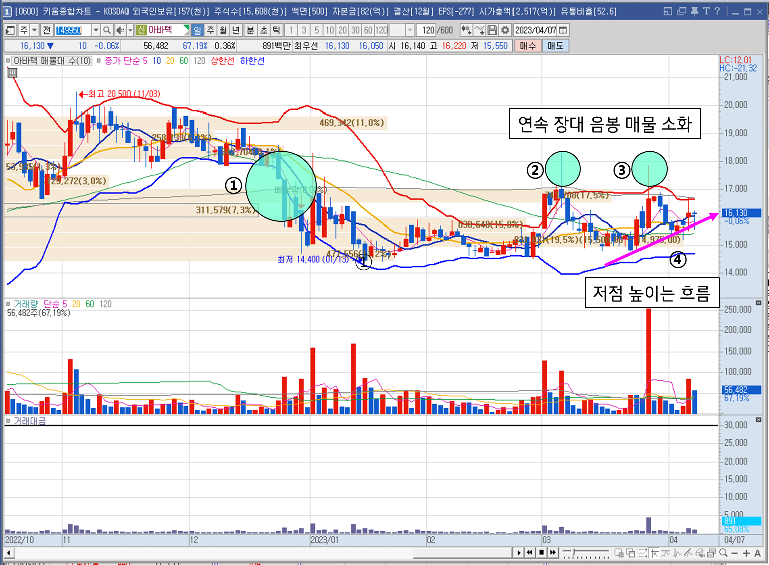 "아바텍"의 일봉차트입니다. 거래량을 제외한 봉차트 만 분석을 해보자면 1번에서 연속으로 출회했던 음봉 두개를 2, 3번에서 소화가 되고 있는 모습을 보여 주고 있습니다. 이후 봉차트의 흐름은 저점을 높이면서 상승하고 수렴하고 있는 모습을 보이네요😋 하지만 앞서 언급한 거래대금이 종가 기준으로 9억 밖에 안돼서 이러한 거래대금에서도 봉차트의 흐름이 예상한대로 갈지는 미지수니 확인해봐야겠습니다.