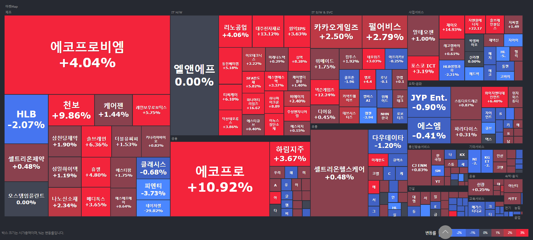 한경 마켓맵을 보면 네이처셀 관절염 치료제 식약처 허가 반려로 인해 하한가에 진입하여 제약주 전반적으로 흐름이 안좋고 게임주, 2차전지, 반도체장비, OLED 장비 할 것 없이 전반적으로 상승했네요
