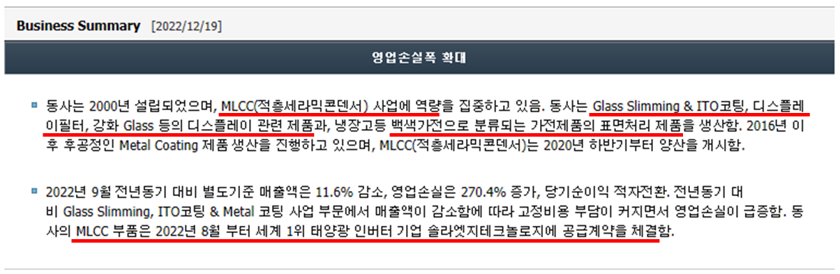 "아바텍"이라는 기업은 디스플레이 관련 사업 및 MLCC 라는 부품을 위주로 사업을 하고있는 기업이네요. 디스플레이 관련 사업으로는 식각/ITO 코팅 사업, 자동차 디스플레이 사업, 코팅 사업을 위주로 하고 있다고합니다. 두번째 사업인 MLCC 사업에서 MLCC 라는 용어가 나와서 용어에 관해 간단히 설명해 보자면 MLCC는 전기를 보관했다가 일정량씩 내보내는 댐의 역할을 하는데 이는 회로에 전류가 일정하게 흐르도록 조절해주는 역할이라고하니 대부분에 반도체, 전자 제품에 이용되는 부품일 것으로 보이네요😮 전자 제품은 필수로 필요한 물건이라기보다는 금전적인 여유가 있을 때 구매하는것으로 경기에 따라 영향을 받을 수도 있겠네요. 그러다보니 경기가 나빠지고 있는 지금 상황에서는 있는 제품을 굳이 새로 구매하지 않는 성향이 나타날 것으로보이니 MLCC로는 당장은 큰 이익을 기대하기 어렵겠습니다.😥