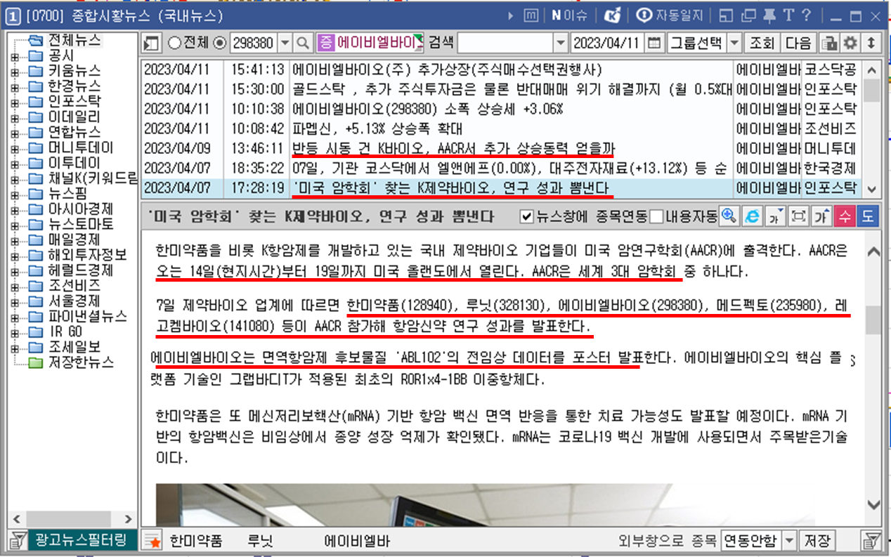 최근에 바이오 관련 섹터가 전반적으로 상승 할 것 같은 조짐을 보여 저도 일부 매수 진행한 종목이 수익을 보고 있는데요. 미국 현지 시간 기준으로 14일에 세계 3대 암학회인 AACR(American Association for Cancer Research)이 열린다고 하네요😅 관련해 대표로 언급된 에이비엘바이오가 시장에서 주목을 받고 있는것 같습니다. 암학회 일정까지 어느정도 기대감을 주가에서 반영 할 수 있으니 관심종목에 추가해두어야겠습니다.