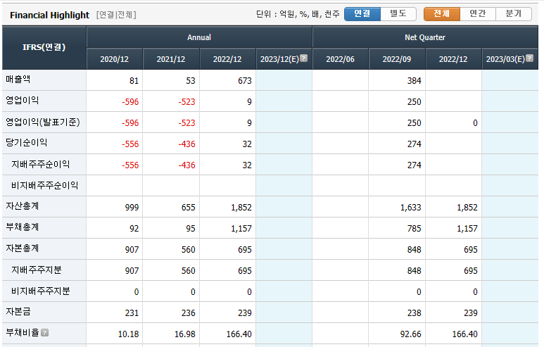 2020년,2021년 500억 이상의 영업손실을 냈고 자본이 점차 줄자 2022년에 약 1100억 정도의 자금 조달(부채 상승)을 한것으로 보입니다. 다행히 2022년에 당기순이익 흑자 전환했으나 2020년 수준의 영업손실이 발생하면 몇년 못 버티고 도산 할 것으로 생각되어 손실이 발생 할 수있으니 증거금 100%로 지정한것 같네요😭