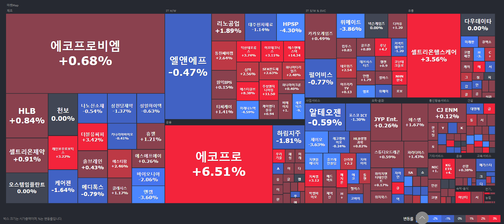 시총이 매우 큰 에코프로 형제, 반도체 소부장, 셀트리온 헬스케어등 시총이큰 종목들이 전반적으로 상승했고 일부 제약, 게임주들이 약했습니다.