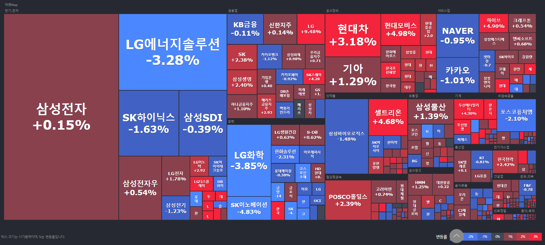 에코프로의 17% 급락 영향인지 2차 전지관련주인 LG에너지솔루션,LG화학,SK이노베이션,포스코퓨처엠(구 포스코케미칼)의 하락세가 두드러지게 보입니다. 오늘 강했던 종목으로는 현대기아차 호실적 기대로 여전히 강한 모습을 보여주고 동반되어 현대모비스까지 상승하고 있습니다. 셀트리온 상승과 더불어 제약 회사들이 움직이려는 모습을 보이니 제약 관련 종목들을 추려 관심종목에 추가해야 겠습니다.