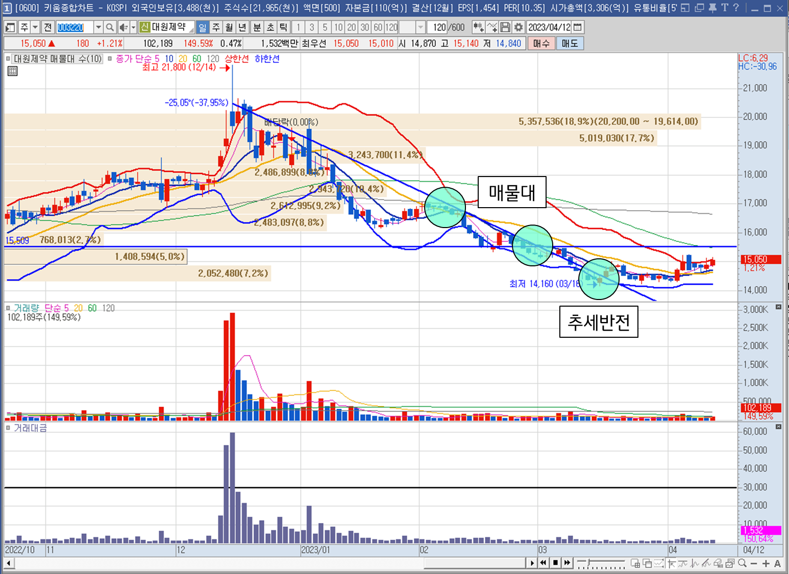 22년 12월 14일 위에 뉴스와 같이 감기약 품귀현상으로 테마성으로 거래량이 한번 터지고 거래량 없이 지속적으로 하락하고 있는 추세입니다. 하락과 동시에 큰 매물대가 형성되고 추세 반전은 했으나 거래량이 없어 매물대를 한참 터치 할 것 같네요 😭 개인적으로 판단하기에 매물대라고 판단하는 기준은 추세선에 근접하여 돌파 할 수 있었으나 힘 없이 하락한 점을 기준으로 봤습니다.