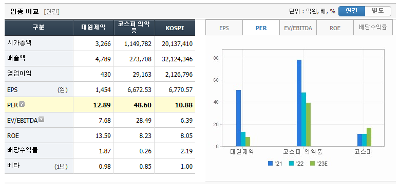 대원제약의 특이점은 코스피 의약품 업종 평균 PER 대비 낮은 PER 수준으로 저 평가 받고 있는것으로 보입니다. 여기서 PER 은 시가총액을 당기순이익으로 나눈 것으로 예를들어 2022년 당기순이익이 307억, 시가총액이 3266억이니 나누어보면 (3266 / 307) 약 10.6 으로 이 회사가 10.6년 동일한 수준으로 사업을 영위하면 같은 회사를 하나 더 살 수 있는 수준이 된다는 뜻입니다.😅