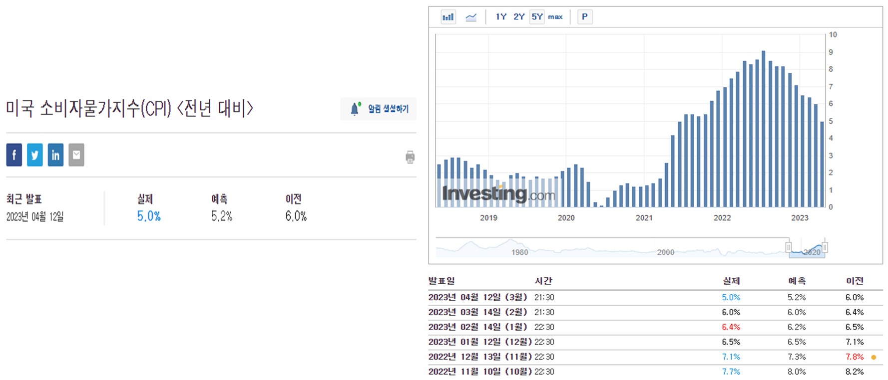 오늘 미국 소비자 물가 지수를 발표했는데요 예상치 5.2% 대비 하회 하여 5.0%를 나타내어 발표 직후에는 나스닥이 상승하였으나 현 시점 (2023.04.13 02:00) 기준 보합권을 유지하고 있습니다. 별다른 뉴스는 없는데 기대감이 선 반영 되어 이미 상승을 했기때문이 아닐까 싶습니다. (귀에 걸면 귀걸이 코에 걸면 코걸이😥) 내일 오전에 뉴스를 확인하고 체크해봐야겠네요. 개인적으로는 야휴 파이낸스를 보고 있습니다.