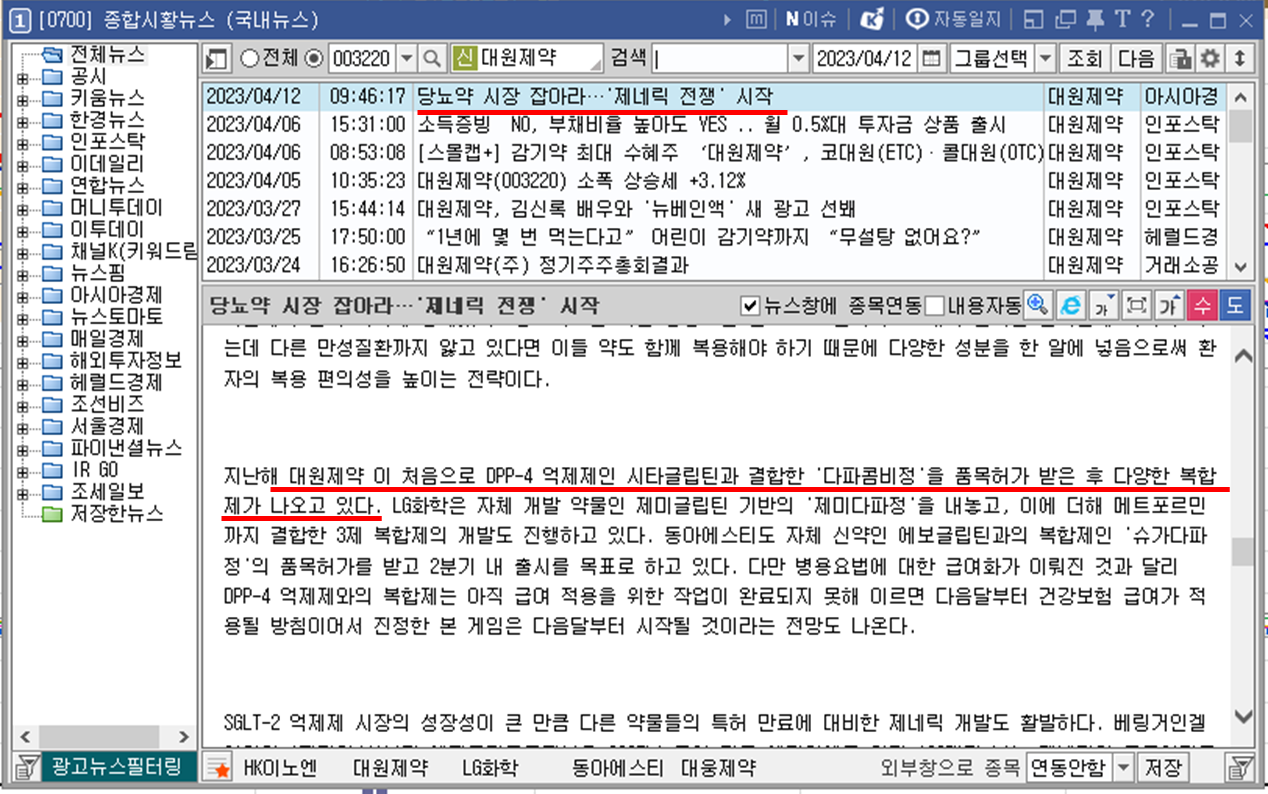 오늘 나온 뉴스로 당뇨병 치료제 특허가 만료되어 여러 제네릭(복제품)을 하고 있는 회사들이 뛰어들어 시장을 선점하려고 하고있는 모습들이 보이네요. 그 중에 대원제약 또한 제네릭을 하고 있으니 부각 되고 있는 모습입니다. 최근 제약 관련주들이 좋으니 여러가지 뉴스가 나오고 있어 지켜봐야겠습니다🤔 위에서 언급한 기대감 부족에서 약간의 기대감이 부각되고 있네요.