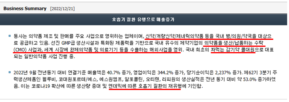 엔데믹 여파로 인해 마스크를 미 착용하는 인원들이 많다보니 호흡기로 발생하는 감기가 유행하고 이때문에 감기약이 불티나게 팔리고 있는것 같습니다. 엔데믹 수혜주 (?) 라고 볼 수 있겠습니다. 요새 마스크 착용/미 착용 인원들이 반반이다 보니 단기적으로 매출 성장 가능성이 있네요!